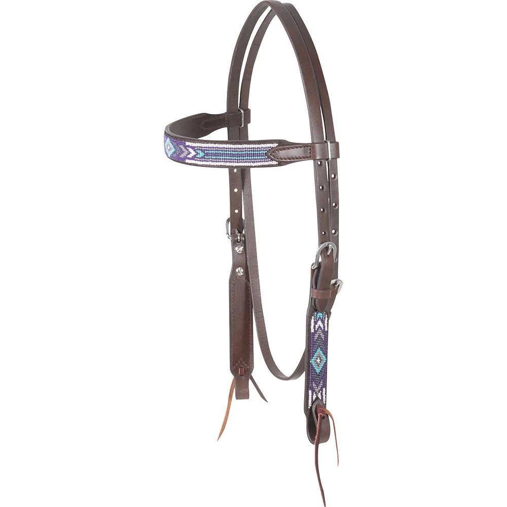 This Cashel Angel Fire browband headstall is made of chocolate skirting leather with blue/purple beaded accents. Features double stainless steel buckles and bit tie ends.
