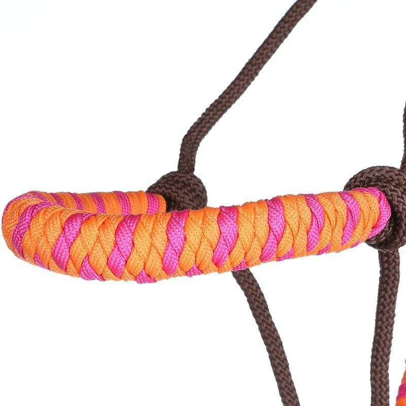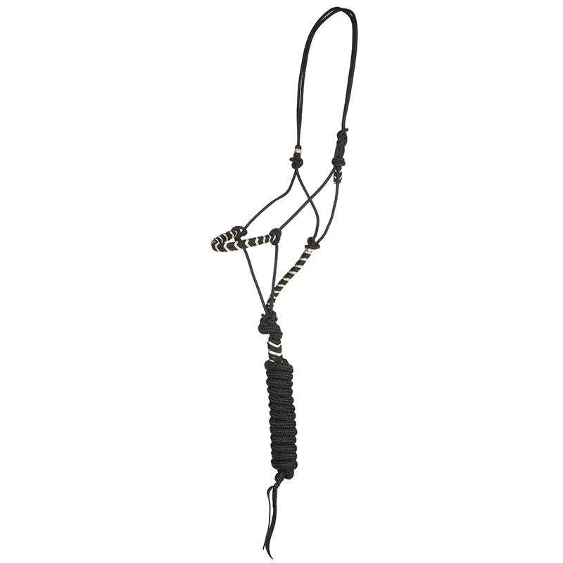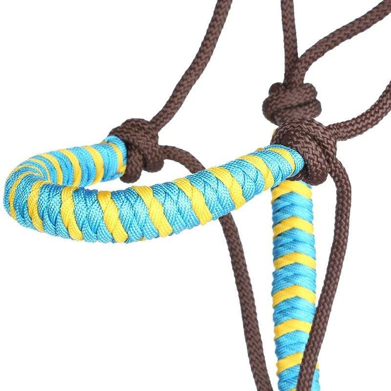 Two tone nylon rope halter with yacht line lead and leather popper. Accented noseband, throat, and lead loop.