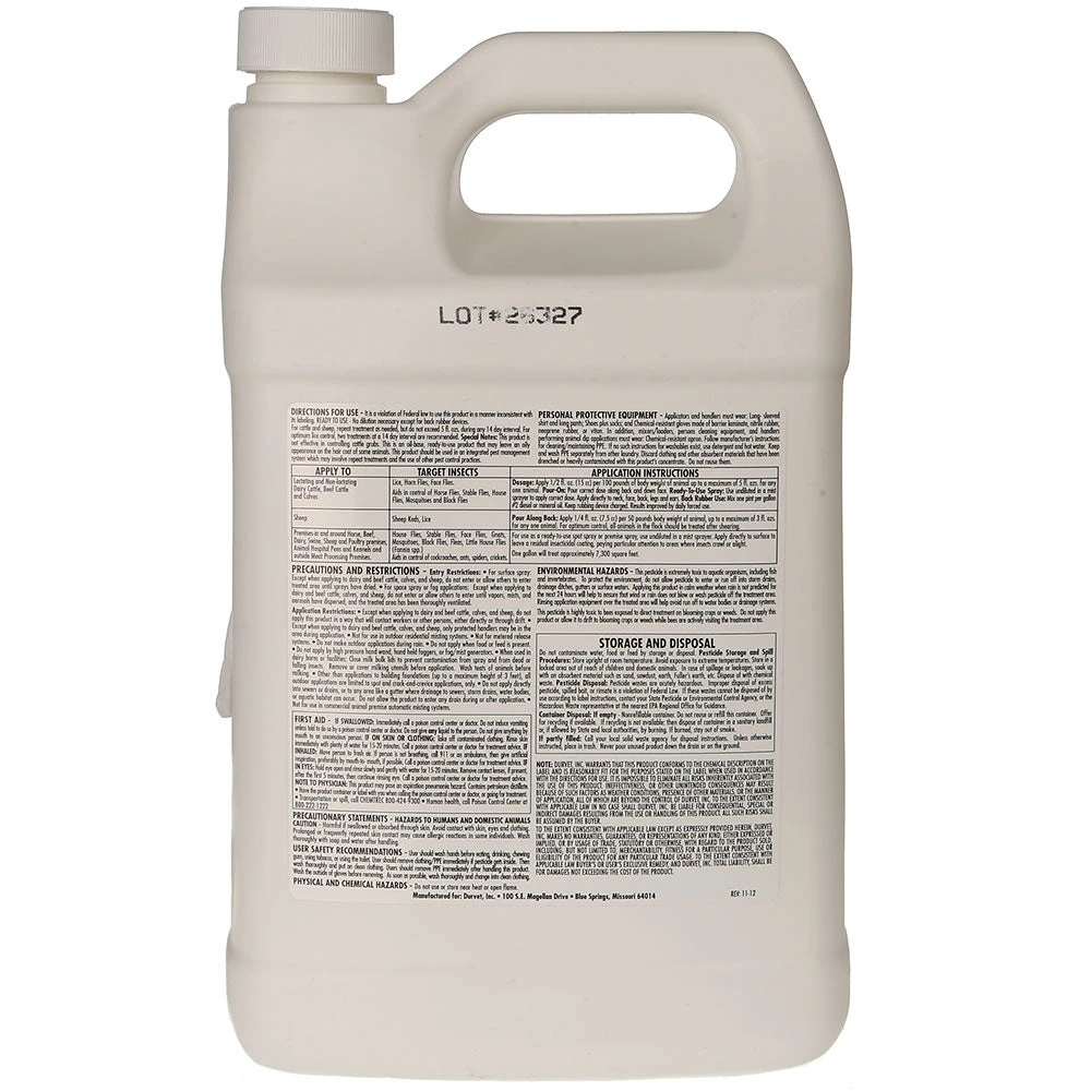 For use on lactating and nonlactating dairy cattle, beef cattle and calves to control lice, horn flies, and face flies. It also aids in the control of horse flies, stable flies, house flies, mosquitoes and black flies. For use on sheep to control sheep keds and lice. For use in and around horse, beef, dairy, swine, sheep and poultry premises, animal hospital pens, kennels and outside meat processing premises to control house flies, stable flies, face flies, gnats, mosquitoes, black flies, fleas, and little house flies. It also aids in the control of cockroaches, ants, spiders, and crickets.