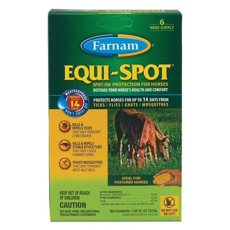 Insects are more than annoying; they can also transmit serious diseases. You can’t always be there to apply fly and insect protection, but Equi-Spot® Spot-On Protection for Horses does the job for you. Applied once every two weeks, it provides long-lasting control against dangerous ticks that can spread Lyme disease and mosquitoes that may transmit West Nile Virus and Equine Encephalitis, as well as biting flies and gnats.
