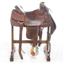 This little pleasure saddle is all roughout so it has a very punchy look. It is an all around youth saddle that is part of the original “King Series” by JTI. The border is hand tooled and the skirts have neoprene in them. It’s on a rawhide covered tree and has semi-quarter horse bars.