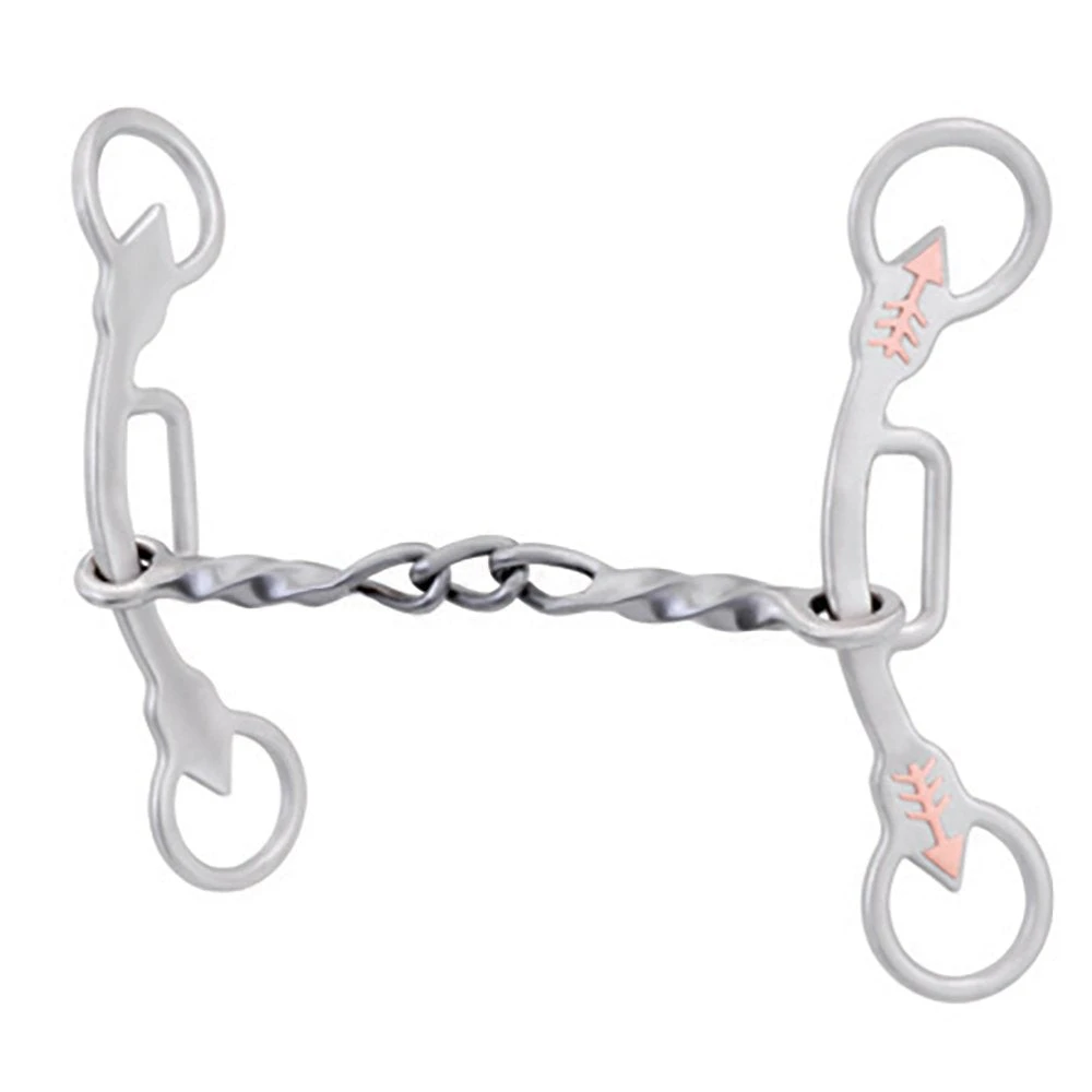 This is a beautiful bit from the new Emilie Veillette Barrel Racing Collection. This bit can be used in other disciplines as well. This gag bit has a unique mouthpiece that is a square twist and chain combo. The Copper Arrows on the side give this bit a nice finishing touch.