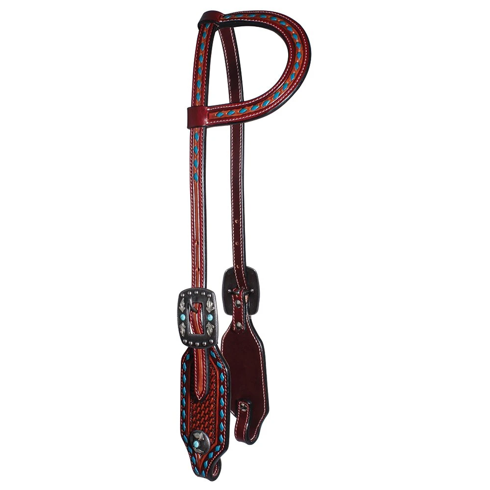 This headstall is sure to stand out. Blue buck stitching and turquoise accented feather buckles take classic basketweave tooling to a new level.
