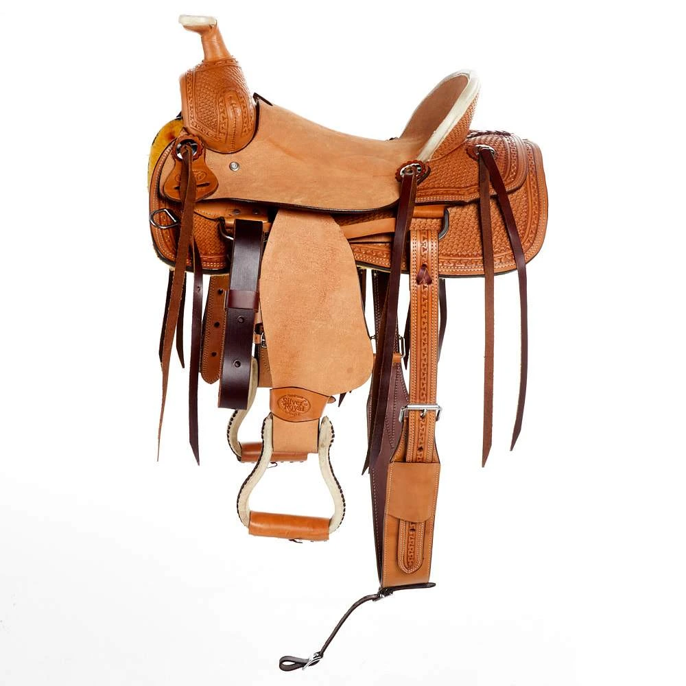 Tough 1 Lincoln youth roper in natural leather with basket stamp. Features a rawhide pencil roll.
